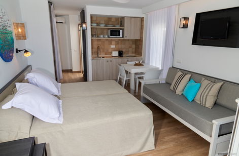 Este estudio incluye 2 camas individuales y 1 sofá cama. Dispone de aire acondicionado, ventilador de techo, TV vía satélite, balcón privado y zona de cocina con nevera. Todos los estudios ofrecen vistas al mar.